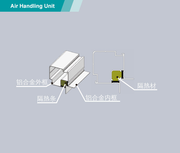 开元集团新一代MAH组合式空气处理机,艾洛斯(Aiolos)系列,采用防冷桥铝合金框架结构设计,面板与框架为压扣连接方式。